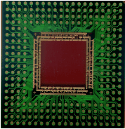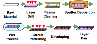 A picture of a portion of a micro-electronic package is shown in Figure 1. Each side of the square has dozens of electrical contacts, which are about 50 µm in width. A simplified process for manufacturing the package with major processing steps is shown in Figure 2. The first step in the process is to laser drill vias (holes) through the substrate. After a number of cleaning steps including plasma treatments,the substrates are placed in a vacuum chamber where metal is sputtered onto the film surface. Any of the processing steps prior to metal deposition can have a direct impact on substrate/ metal adhesion. The remaining steps in the process are generally “wet” processing stages, where patterning is performed using standard lithographic techniques. The primary objective of this investigation was to understand the adhesion mechanism of metal to a polyimide substrate, and to improve the level of metal adhesion, which initially was below the level required by customers.