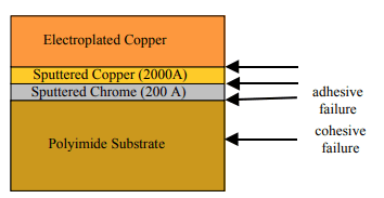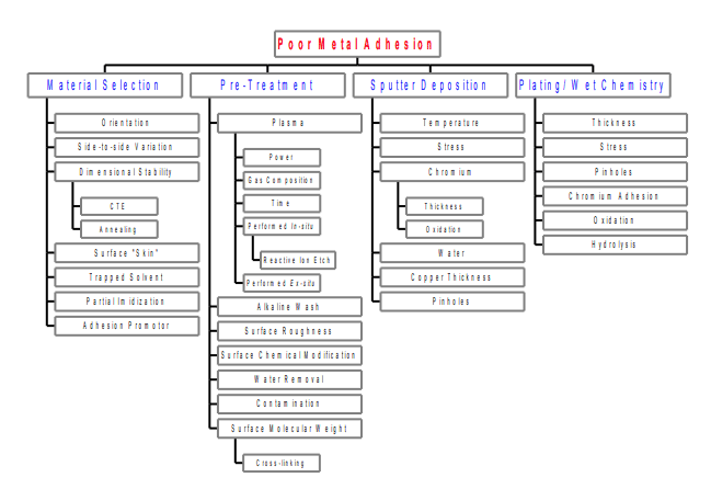 In performing root cause failure analysis, it is important to fist identify all major factors which can have a direct impact on adhesion. We examined four areas as indicated in Figure 5: (1) material selection; (2) substrate pre-treatments; (3) the sputter deposition process; and (4) plating/ wet chemistry issues. Material selection refers to issues like side-to-side variation, surface composition, dimensional stability and polymer orientation. Typical pre-treatments include solvent washing, plasma and reactive ion etching (RIE). Conditions during sputter depositions are critical, such as temperature, pressure, plating quality, and oxygen content. Also, there are wet plating issues such as thickness, stress, and pinhole formation in the conducting layer.