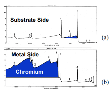 The first step in the root cause failure analysis is to establish a fault tree with all possible failure modes, and identify analytical methods to characterize the potential faults. One of the initial tasks is to determine the failure mode (i.e., the location of the weakest interface). In the study, XPS clearly determined that the low peel strengths were associated with adhesive failures between the polymer substrate and the sputter deposited chromium layer. Other analytical techniques can be used depending upon analysis depth ToF-SIMS (10 Å), XPS (100 Å), SEM or FTIR (1 µm). Multiple analytical techniques may be required. For this study, we used XPS, AES, ToF-SIMS, FTIR, SEM, AFM, surface energy, XRD and mechanical testing.