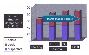 of the peel and (b) the metal side. The substrate side is predominately polyimide, while the metal side is chromium. This indicates that the failure mode is adhesive, meaning that the failure is located between the substrate and the sputter deposited chromium layer. The peel strengths of these samples were typically < 1 lb/ in. However, the peel strengths required by customers are > 4 lb/ in. These original substrates were chemically etched and rinsed with water. XPS analysis detected a number of residues left on the surface (e.g. etchant and rinse residues), which accounted for the poor adhesion. Using plasma treatments, with O2 and O2/CF4 plasma compositions, significant improvements in bond strengths were observed. Again, XPS was used to identify oxygen functionality incorporated into the surface consisting of basic groups, such as alcohols and ethers (C-OR), carbonyls (-C=O) and esters (-COOR), which form chemical bonds with the sputter deposited chromium.